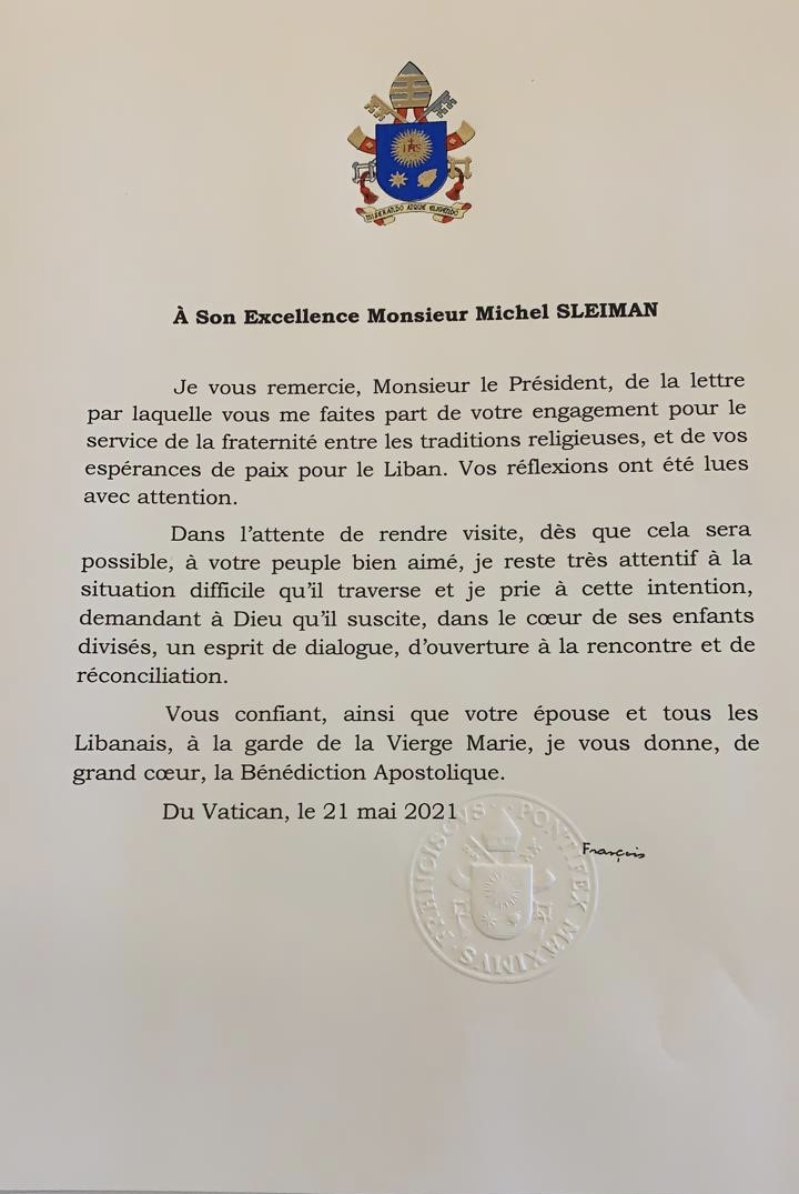 رسالة البابا الجوابية رداً على كتاب الشكر الذي وجهه له الرئيس ميشال سليمان عندما زار العراق في اوائل اذار ورحب بزيارته التي ينتظرها لبنان، وقد اقترح على قداسته عقد سينودس في الفاتيكان لطوائف المنطقة العربية استكمالاً لوثيقة الاخوة الانسانية التي وقعها مع شيخ الازهر .